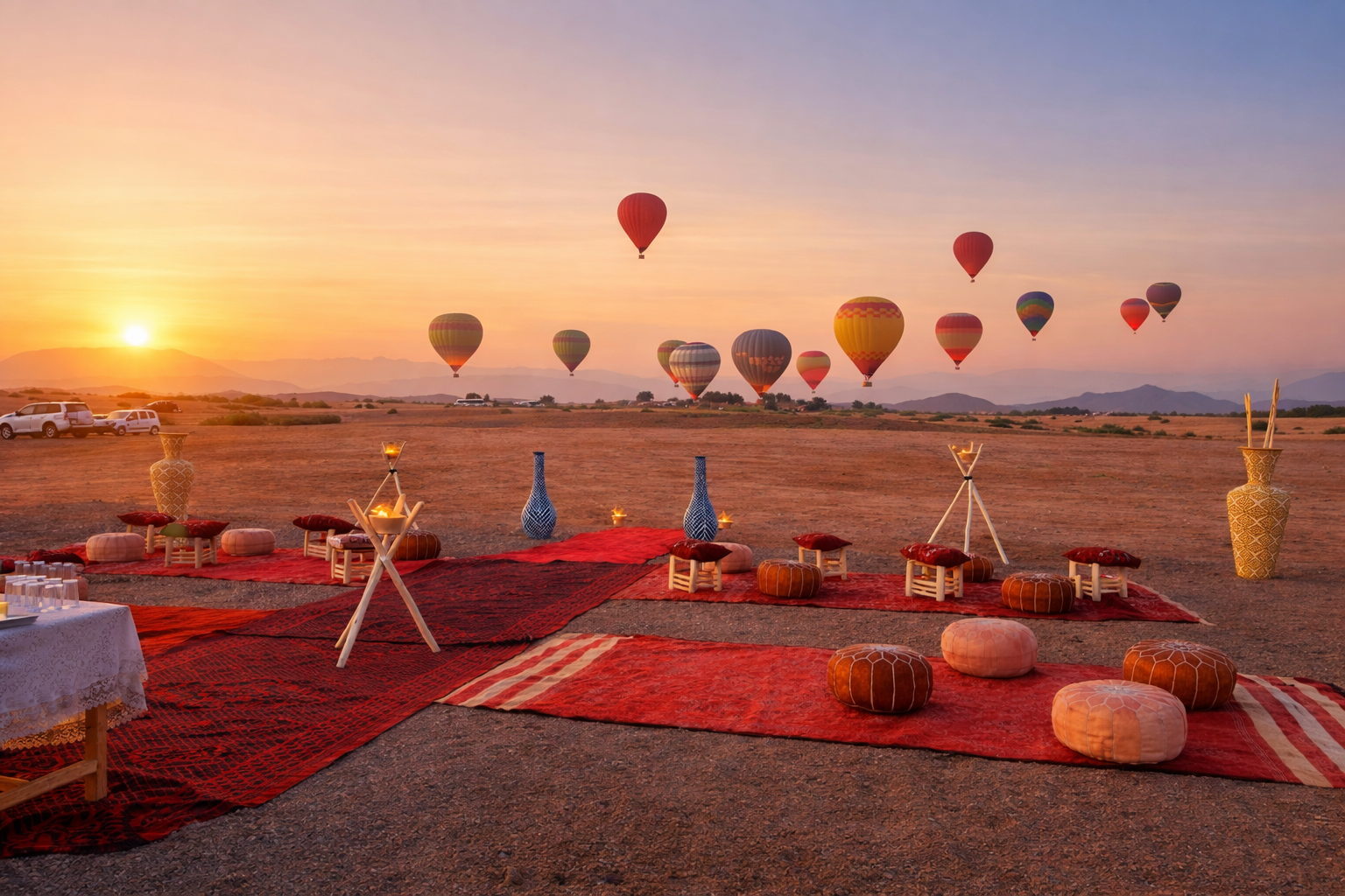 Treat yourself to an unforgettable experience, a unique journey between heaven and earth. Everything begins before dawn with a comfortable pick-up directly from your accommodation. Upon arrival at the launch site, our warm team will welcome you with an authentic Berber breakfast – enjoy mint tea, local pancakes, and other specialties. With the first rays of sunshine, you will watch the giant balloon inflate as the Atlas Mountains and the desert surrounding Marrakech begin to wake up. After a thorough safety briefing, you will step into the basket and experience that magical moment: take-off. You will float for about one hour over the enchanting ochre landscape. Beneath you, the majestic peaks of the Atlas, traditional Berber villages, and endless palm groves unfold. After a safe landing, you will receive a flight certificate, and we will comfortably transport you back to your accommodation.