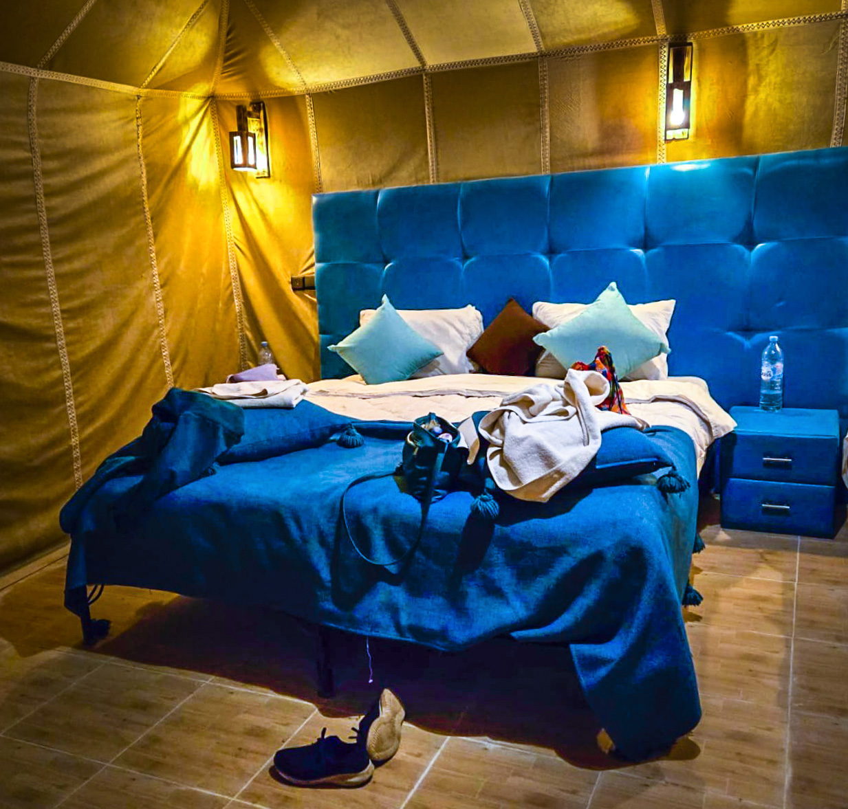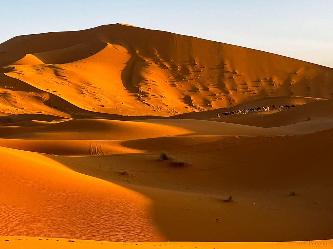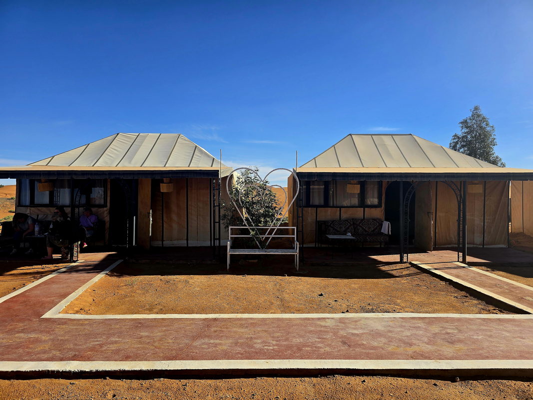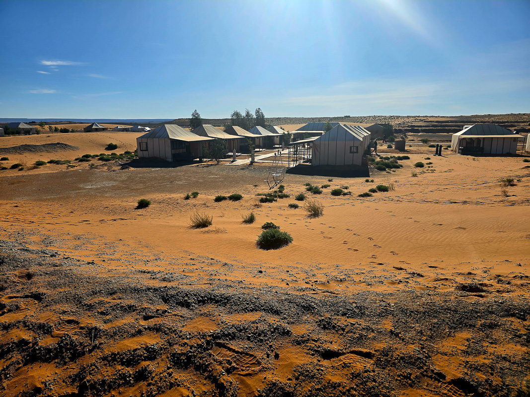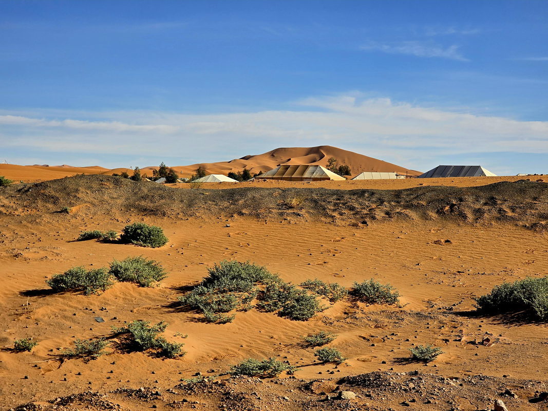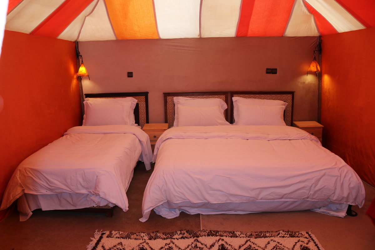 Afterward, we head to Merzouga, where our camels await. We will trek across the warm, golden desert sands to an extraordinary luxury camp for the night. You will be accommodated in tents offering full comfort, including private bathrooms. After a hearty dinner, you can enjoy traditional Berber music by the campfire or simply walk through the dunes and gaze at the brilliant starry sky.