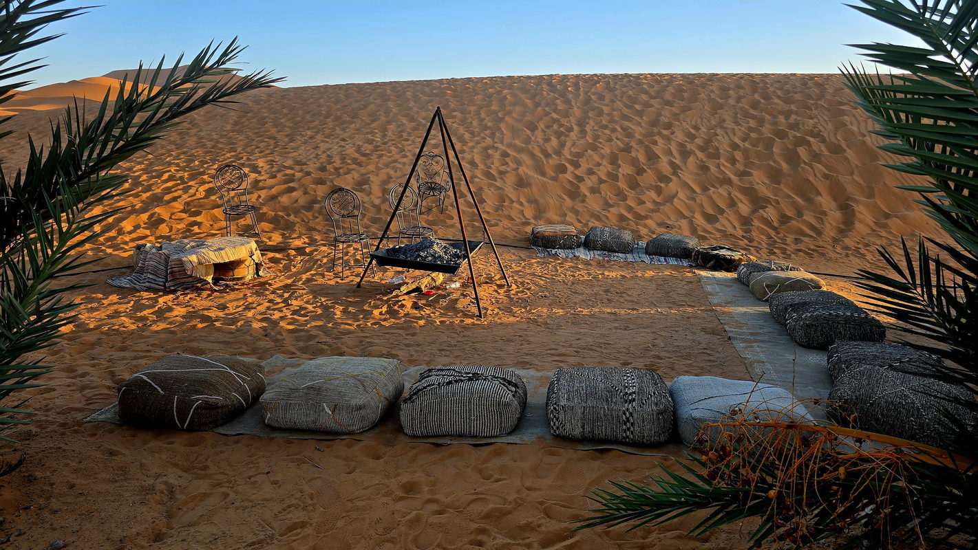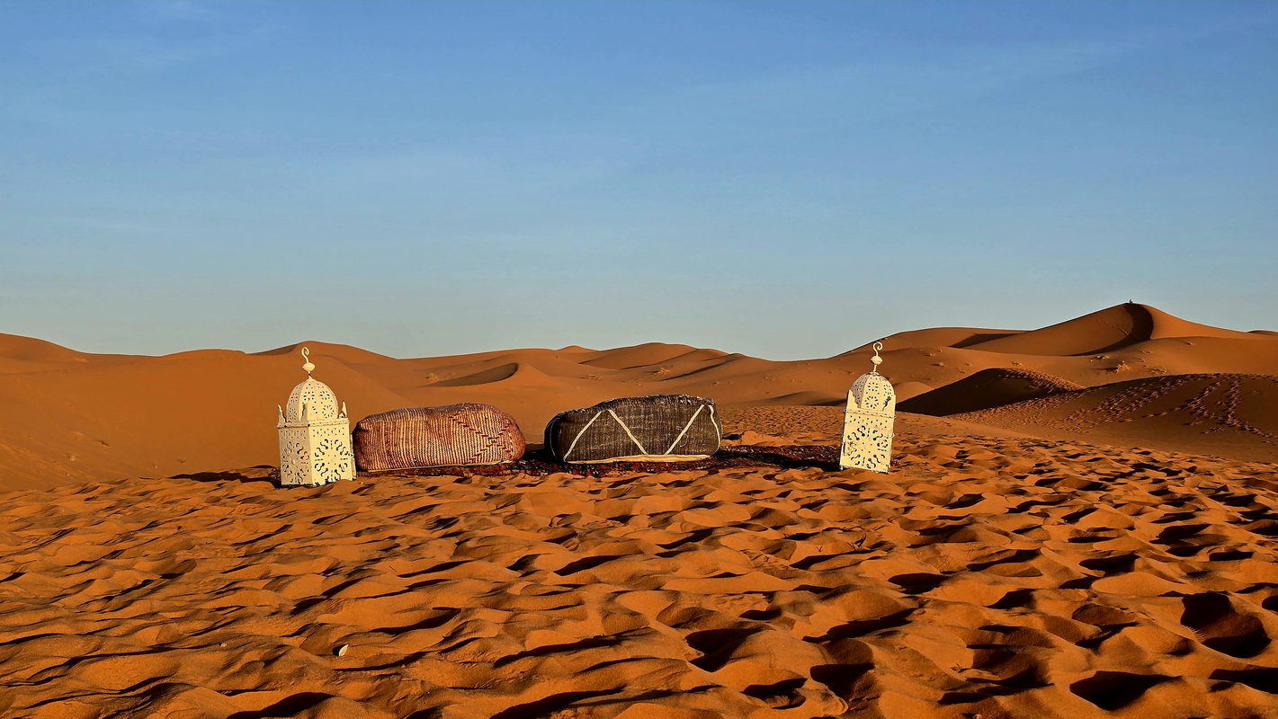 From there, we continue to Merzouga, situated at the foot of the majestic Erg Chebbi dunes. Here, your camels will be waiting to take you on an hour-and-a-half trek into the heart of the desert to witness an unforgettable sunset. We will spend the night in a luxury Saharan camp, where you can enjoy dinner under a canopy of stars, accompanied by traditional Berber music around the campfire.